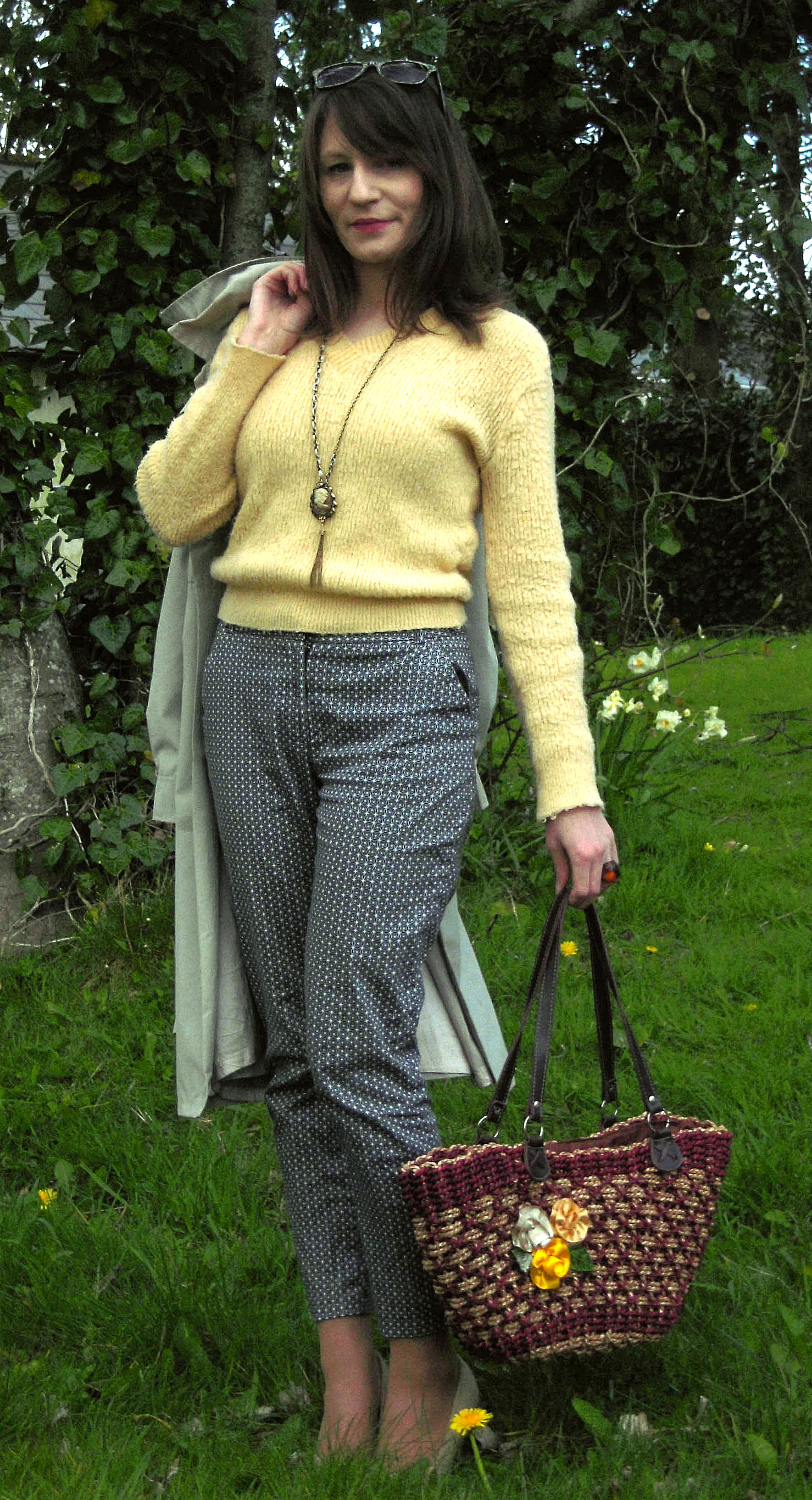 Sunglasses an ancient pair from Penneys €1.50; Trench coat is vintage; Sweater courtesy of my Nana; cameo necklace, print trousers and nude shoes €1.50, €8 and €10 respectively from Penney’s, wicker bag a gift.