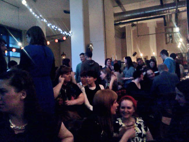 Back to the style though, it was typical hipster fare. I do realise that remark is quite flippant given the nature of hipster attire. Well, it was a jumble and a nice jumble. Other semi-hipsters made an effort too, I saw lots of Topshop style jewellery and nice flats. I wore a red dress with daisy print from Topshop that I bought in January in the sales, with flesh tights (!) and black ankle boots from New Look. I wore a jacket too, plain army green. Again, I must apologise for lack of personal style photos but until I buy a proper camera such pictures are impossible in the dark (no flash on my phone). However, here is an idea of the atmosphere.