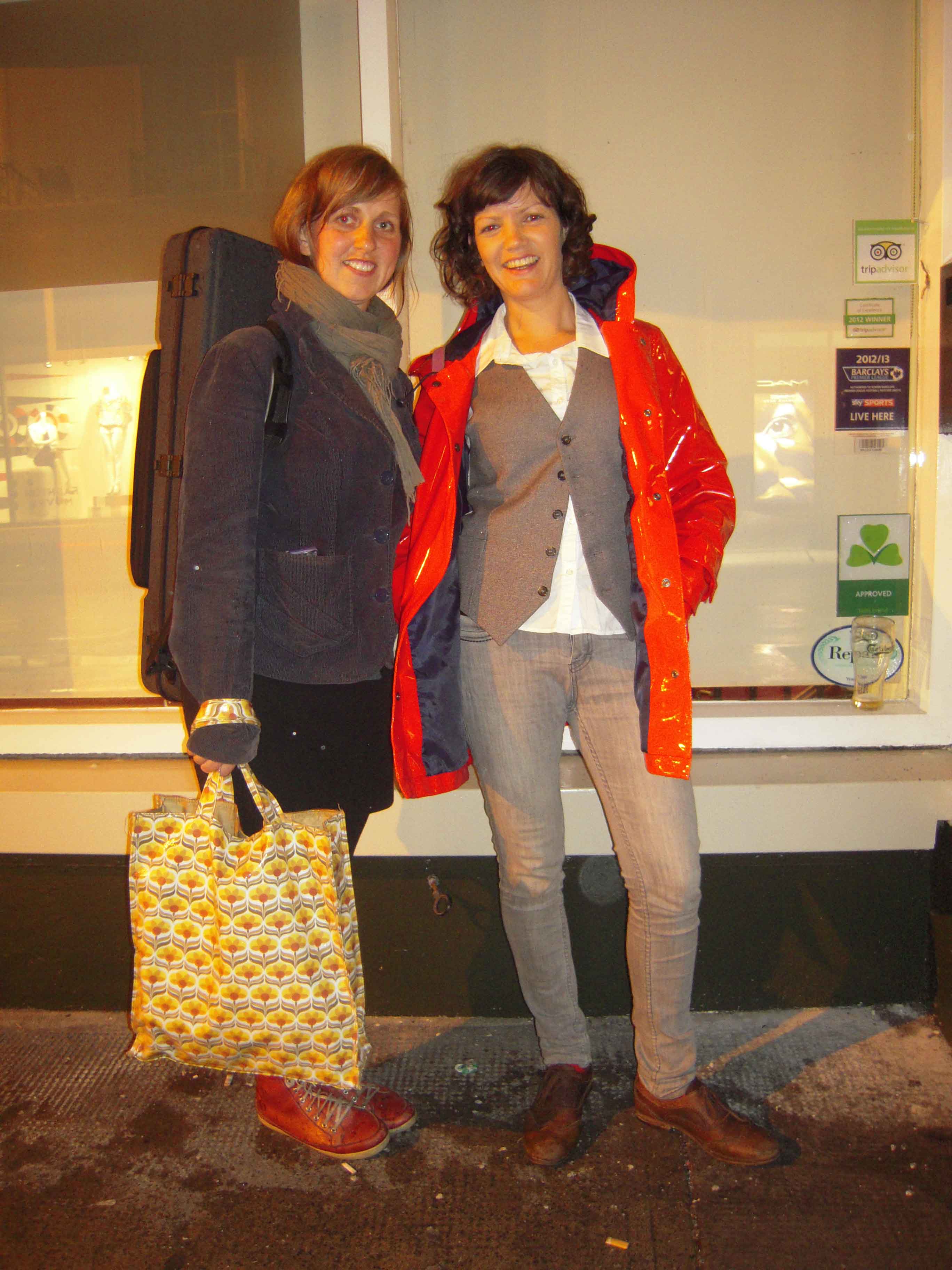 Stephanie is sporting the ultimate West of Ireland accessory -a fiddle – and don’t you just love her weather appropriate carrier-bag? Taking note to get me one of those. Emma dons her famous red raincoat over a suitably updated Annie Hall-esque ensemble. You can (and should!) follow the girls on twitter @riversandcrows and catch them on Facebook https://www.facebook.com/RiversAndCrows to keep wind of any upcoming gigs.
