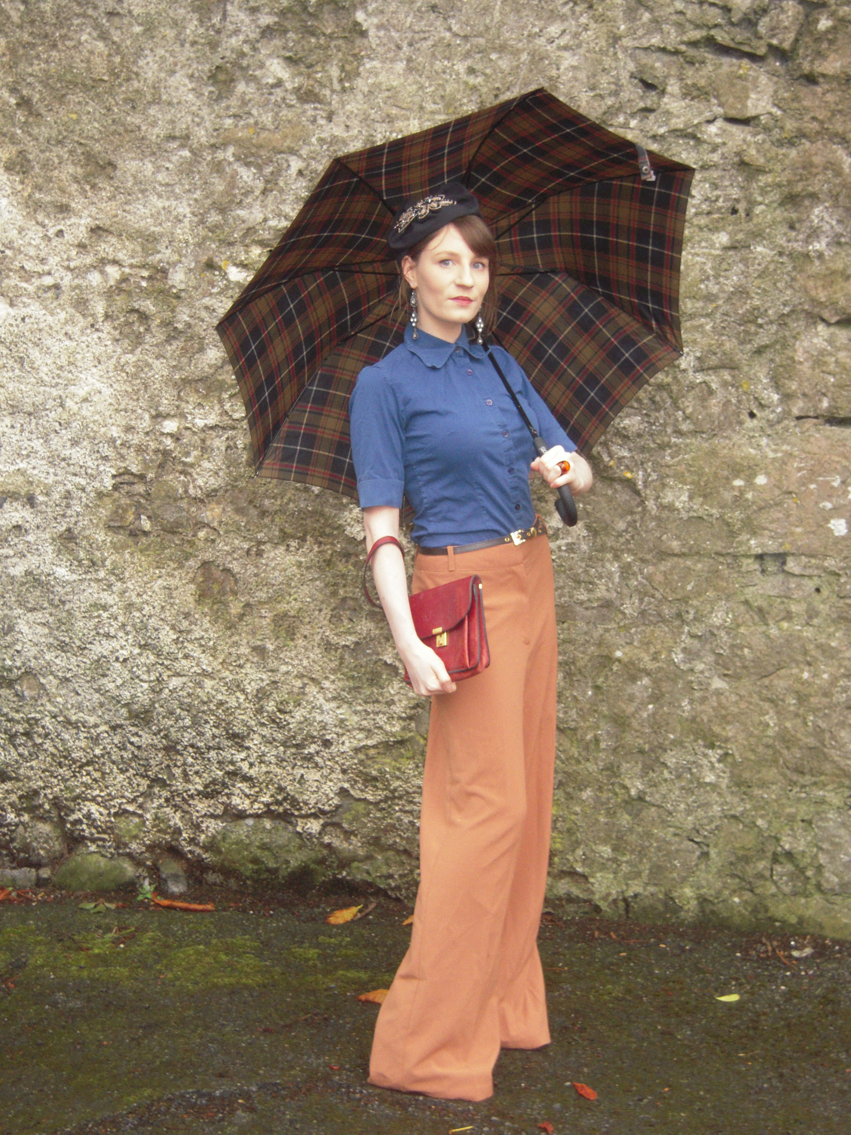 Because my exposed middle was feeling the chill I wanted to go in a completely different direction for the next ensemble. Looking to Katherine Hepburn and her no-nonsense but genteel, chic style I took a pair of Dunne’s wide-leg trousers, Miss Selfridge shirt (a relic from my teenage years), my mother’s lovely 1980s clutch and the same accessories; Topshop earrings and some market stall rings . It’s more of a serious lady racer style (I would have liked to have added a pair of binoculars, Queen Elizabeth style). The pants are really long and not great for trailing along the wet ground – one of my biggest fears are soggy cuffs with damp that travels up and touches my leg. Shudder.