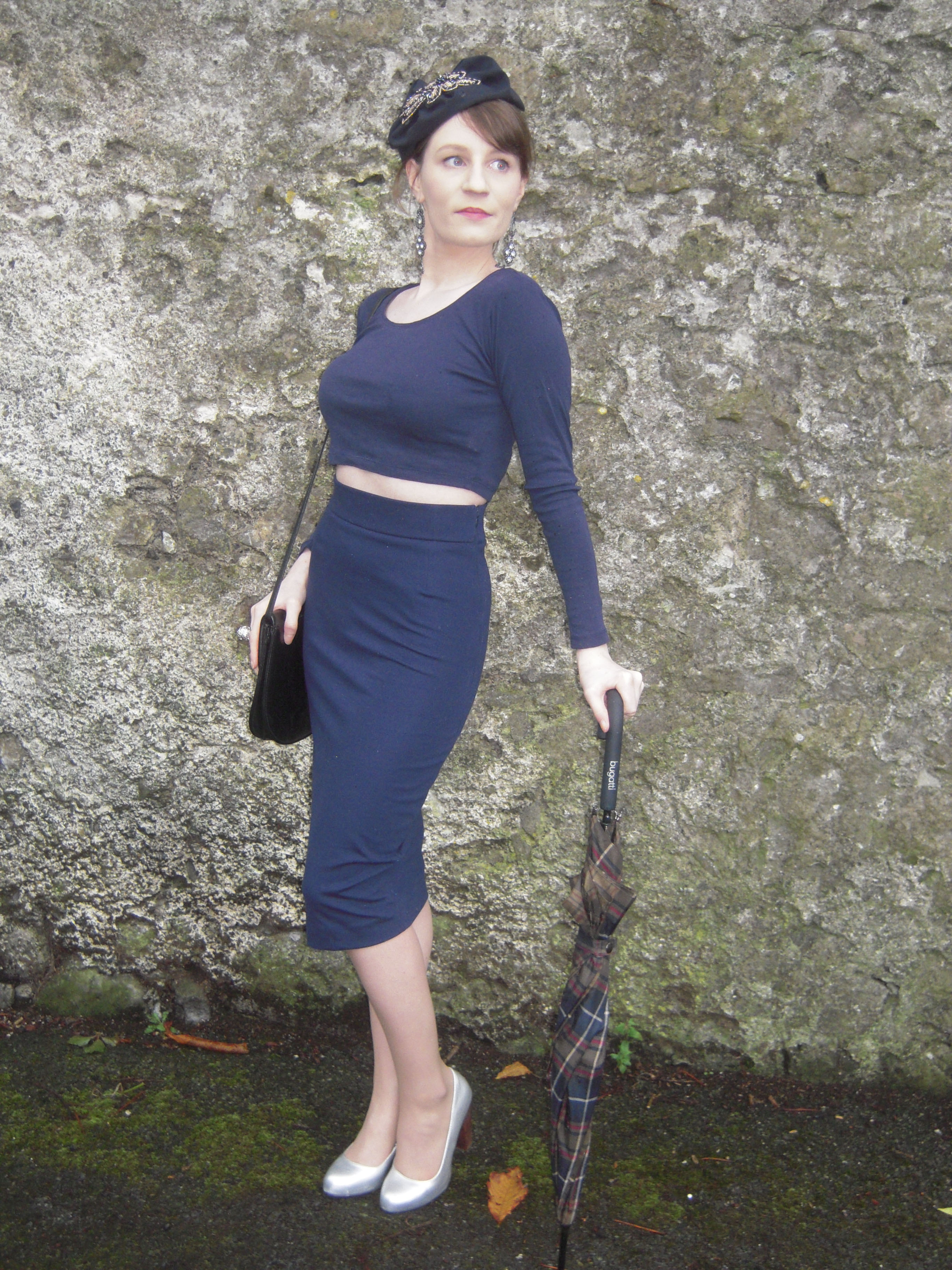 Yes, that is a crop top. No, I do not have rock-hard washboard abs (for feminist reasons only, I don’t want an antiquated stamp of forced domesticity stuck to my abdominal muscles! (ahem)). But a hint of flesh around the rib area can give the illusion of a stomach as flat as a generic pop star’s (see TM’s previous post, Top of the Crops, for more on that subject). It’s a “Penney’s Best”, as is the high waisted pencil skirt, the silver shoes are a charity shop find, the umbrella (essential!) is Bugatti, the bag I found buried under some others at the end of my bed. The headpiece is by milliner Catriona King. I was going for a pared back, Rooney Mara-esque silhouette, a classic, slightly 40s look modernised.