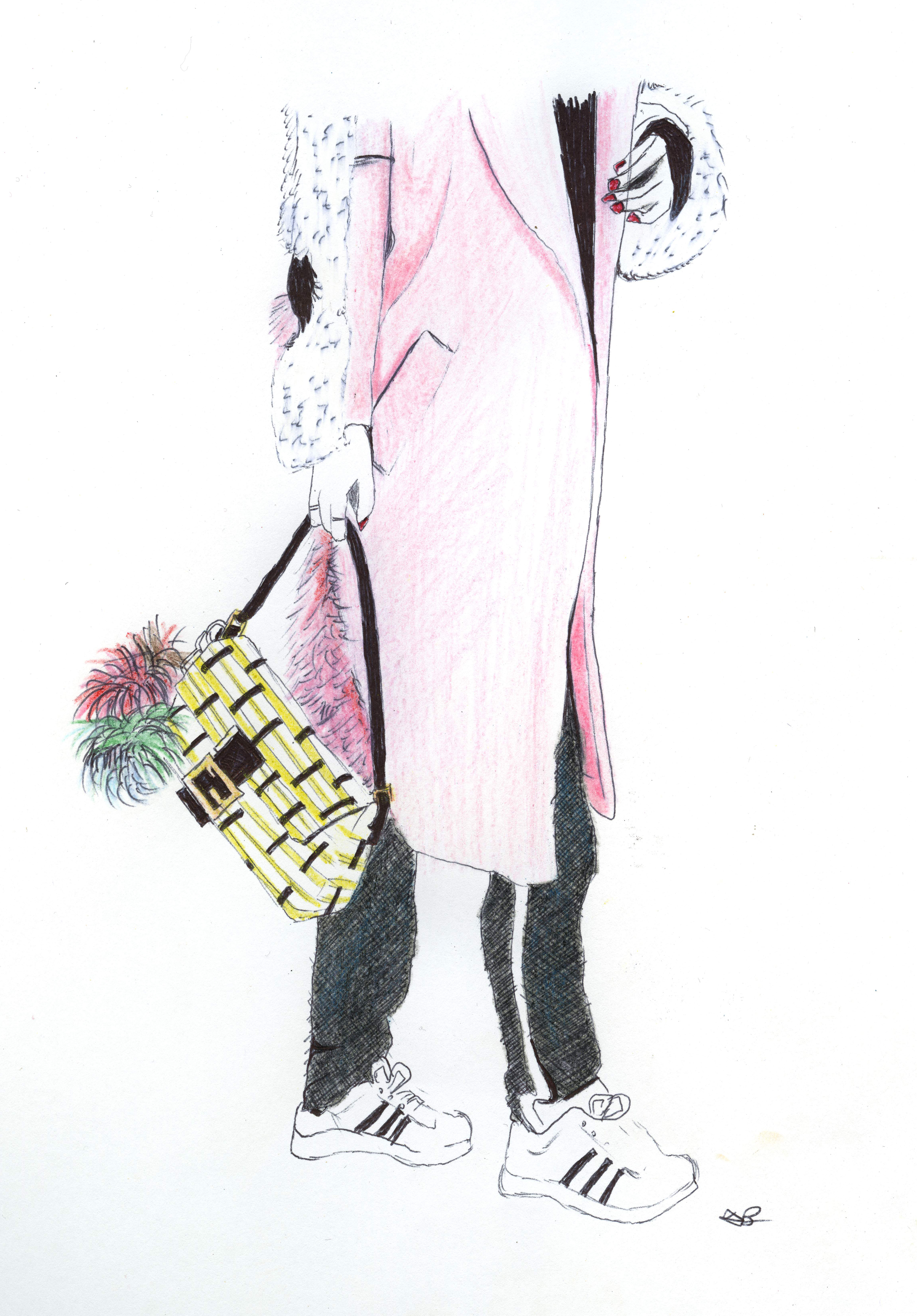They say wear pink to make the boys wink, but this outfit is something of a man repeller, what with its funny combos of tracksuit bottoms (good God), fluffy rose -hued oversized coat, red nails (pink and red is officially a Thing by the way), pom poms – always be prepared – and the now expected pair of trainers. You can say what you like but this individual is probably the most comfortable she’s ever been. Who says pain is beauty?