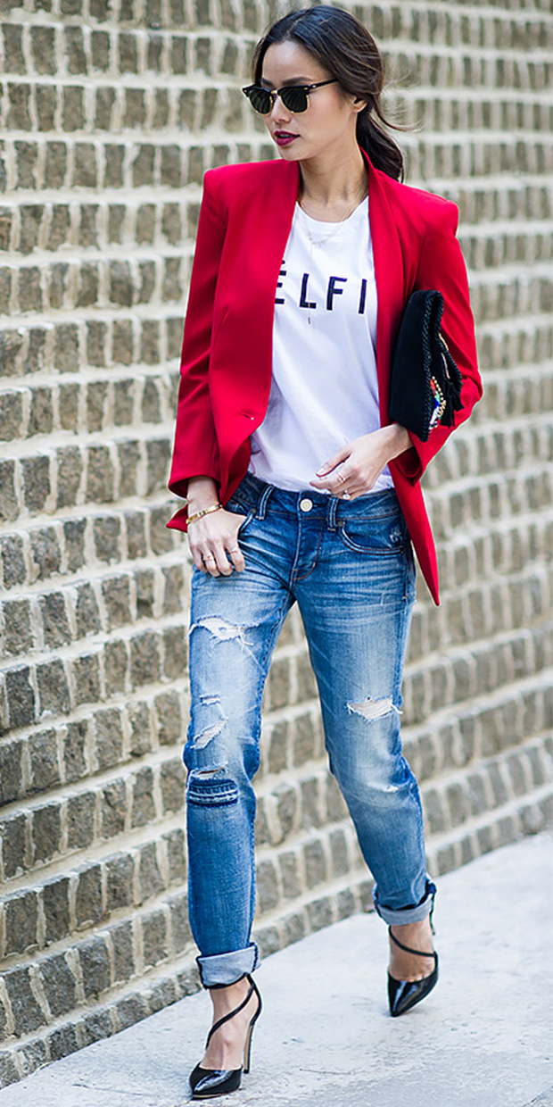 Loving the simple look of Jamie chungs jeans. tee and RED jacket..gorgeous! xxx