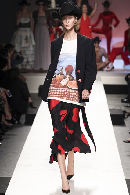 Before Scott took the helm at Moschino, the house celebrated its 30th birthday with an homage to all that went before, culminating in a riot of prints and patterns celebrating its Italian heritage. Check out the still-life top above – perfect for sitting down to a tasteful Mediterranean feast in an olive grove, no?