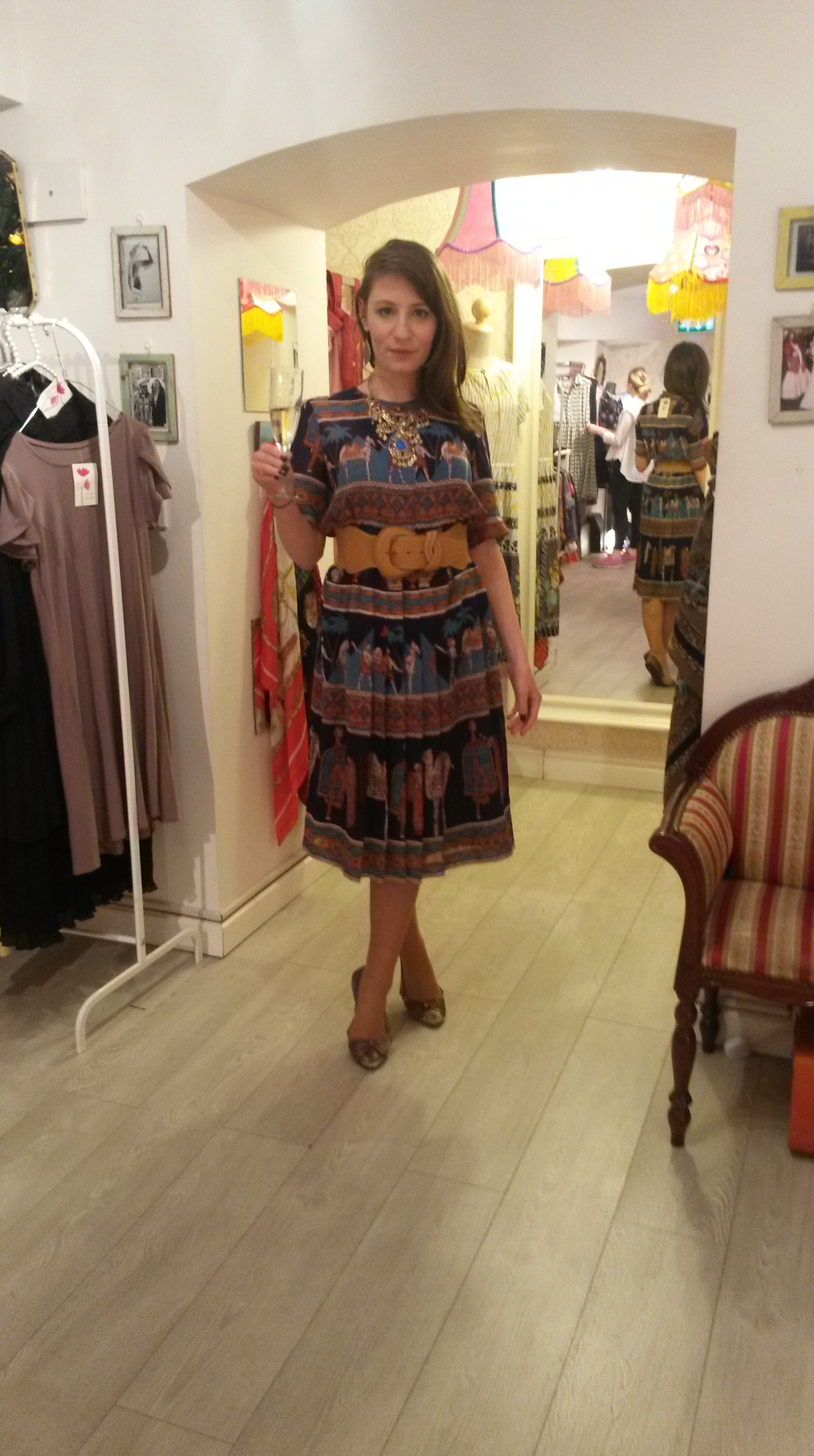 After a happy hour or so there, we wandered around with our beady eyes constantly a-darting for sartorial inspiration. Since we were in the area, we just had to pop into one of our favourite boutiques Om Diva. Luckily for us, they were having a promotion day so the prosecco was flowing and spirits were high. We both walked away with gems we were delighted with; a dress with tee-shirt top and sheer bottom (and a belt to match!) for me and this, for CM.