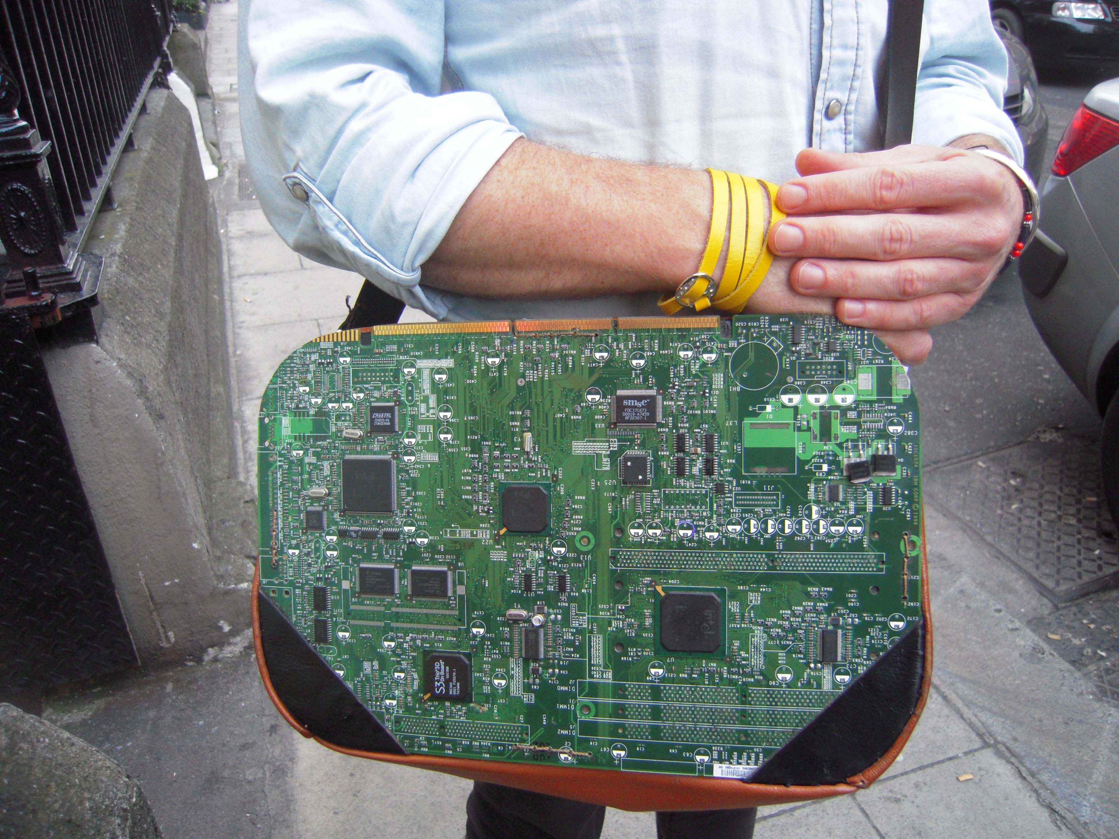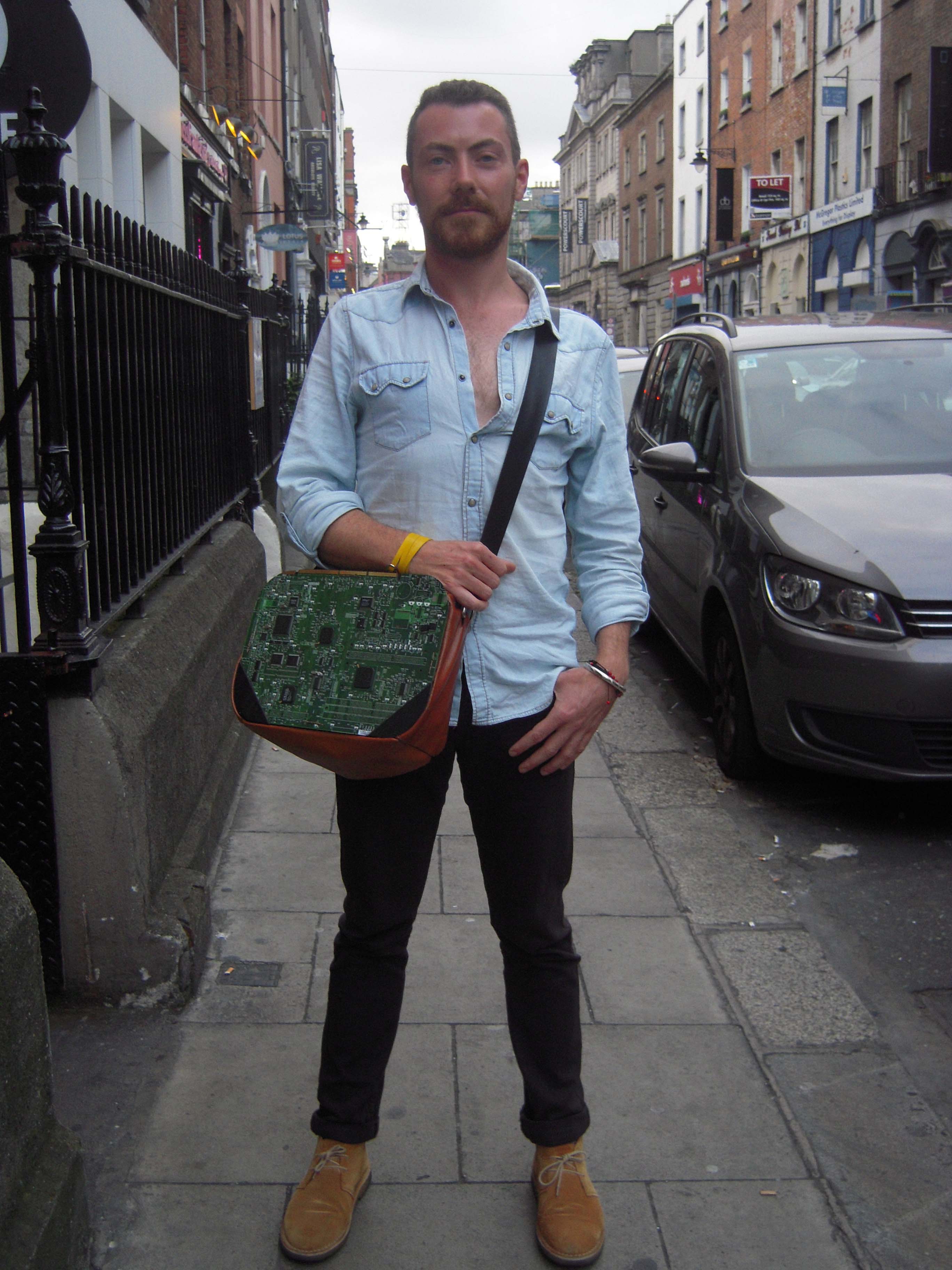 This is an effortless looking ensemble that we would copy. He has the curious groomed/scruffy thing down to a T and he made his own bag.