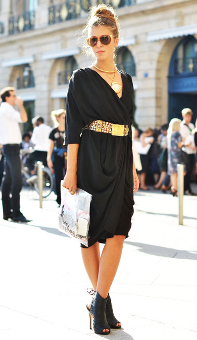 This is a brilliant beat-the-humidity ensemble. Loose (even the belt is loose!) and black – so that potential moist patches don’t show (eurgh!) – hair up, sunglasses on, it can be worn to work, jaunting about town or for a night-time event. It’s chic but looks so comfortable.