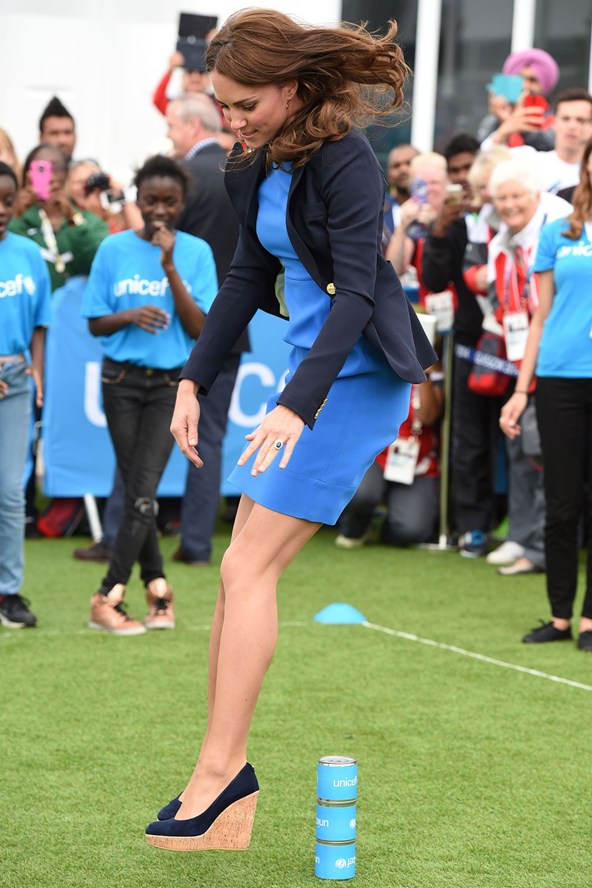 It’s the curse of occasion wear, if not actually the problem with getting dressed every day – are you suitably primed for anything and everything that life has to throw at you? Yes, you can take an umbrella, sun glasses, spare pair o’tights in your bag, but what if you have to unexpectedly hobble over some grass in a park, or worse, take to a playing field? I was really rather impressed with Kate and her wedge-jumping prowess, when called upon at the Commonwealth Games to play “three tins” (I don’t know either). But she’s a pro, and has gamely risen to the challenge before, having taking in a game of field hockey in a pair of her trusty heeled boots.