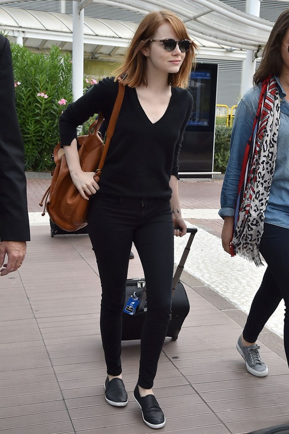 A nice, casual travel outfit. Comfy and stylish, great roomy bag and so simple with barely any jewellery – good advice for the airport security rigmaroll we all have to endure, leading lady or no.