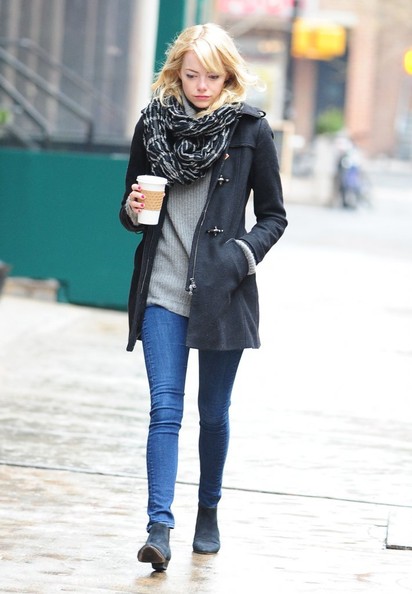 Emma tends to favour a real normcore day style; jeans, sweater over a shirt, flats or boots, a nice bag and a pea coat. Neutral colours are also her go to, complimenting her skin tone and hair colour, whether it’s her naural blonde or trademark red. Now that we’re entering the cold season these are handy looks for every day chic. Cosy little socks and waterproof ankle boots are really kinda essential, and a big statement scarf can take one outfit and make another!