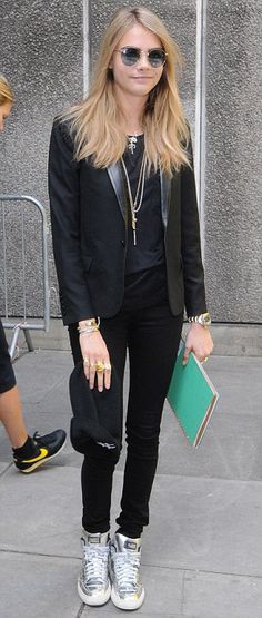 An outfit I have in mind involves the skirt I mentioned before that I would pair with a chunky knit, but I would subtract the knit and wear a lighter, but loose top. Bare legs, short skirt, your silver runners and a winter coat do look cool but as the temperatures drop, black tights can certainly be worn.