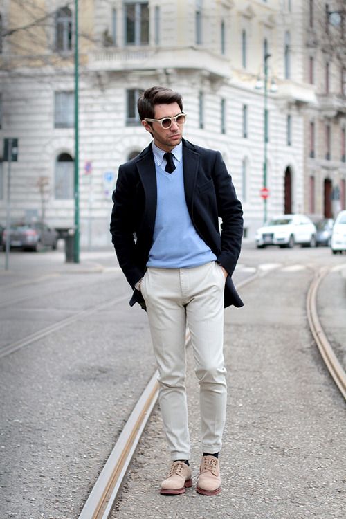 It’s chilly out there and chino style pants are rather draughty. Wear long-johns under them if you’re feeling the nip. Looking up, a jumper with a slight v-neck is just the thing for pulling over your nice blue shirt when the temperatures drop. In case the weather is mild or you’re going to a pub that might heat up, you can get away with wearing this kind of sweater on its own. Just make sure the neck isn’t too low or you’ll end up looking like a cast member of TOWIE.