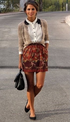 This is a great everyday look that anyone could pull off, it looks put-together and professional without being mumsy. The cardigan adds more interest than your average v-neck sweater, and can be found in any high-street shop (or your local school uniform supplier!*)