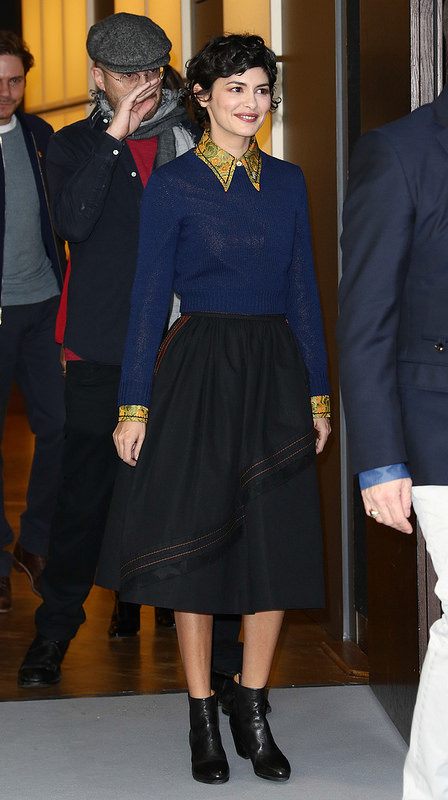 This look on Audrey Tautou may not be for everyone, but I love it. 70s collars are most definitely back in (see also Jena Malone, above) and the blue and navy combo is a brave one. Yes, the ensemble would be taken to another level if she wore a pair of pumps to reference the cuffs and collar, but the boots are a quirky little touch that only the most confident could get away with.