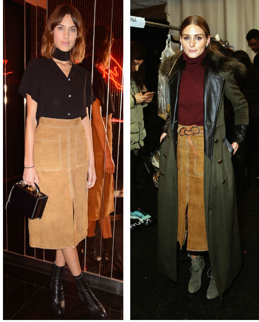 Although I focus on the button down denim skirt, a cordoroy or suede version look amazing and can be worn day to night too. OK, the example below doesn’t have buttons but it’s the same idea and Alexa Chung and Olivia Palermo, in their own individual interpretations, have got the styling spot on. And let me tell you a little secret – the skirt’s from M&S! It’s from their pricer range but still, M&S! It should be in stores in May.