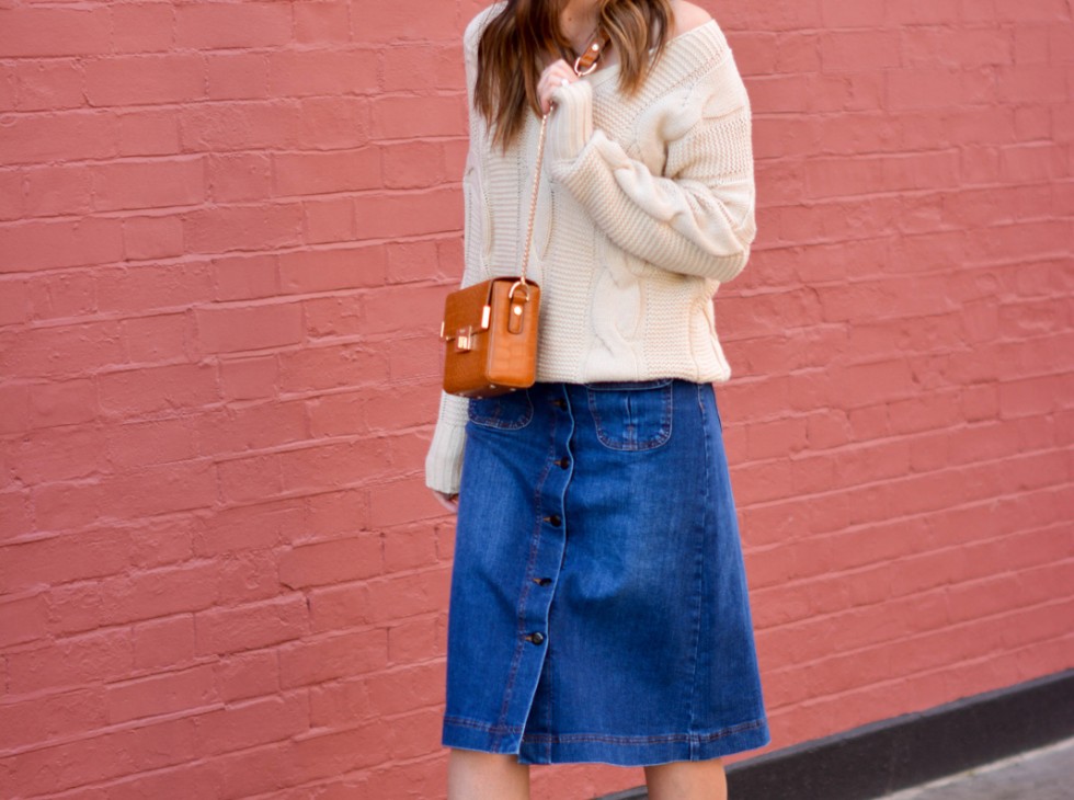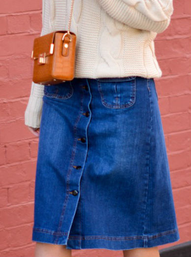 Think of the button down, A-line, denim skirt as your new jeans alternative. Wear it paired with a chunky knit and later on in spring with a slouchy Breton top. Add an ankle boot or low heeled, low key heel like the one above for meeting your gal pals for brunch or pair with a loose t-shirt, long cardigan and flats for a jaunt around town.