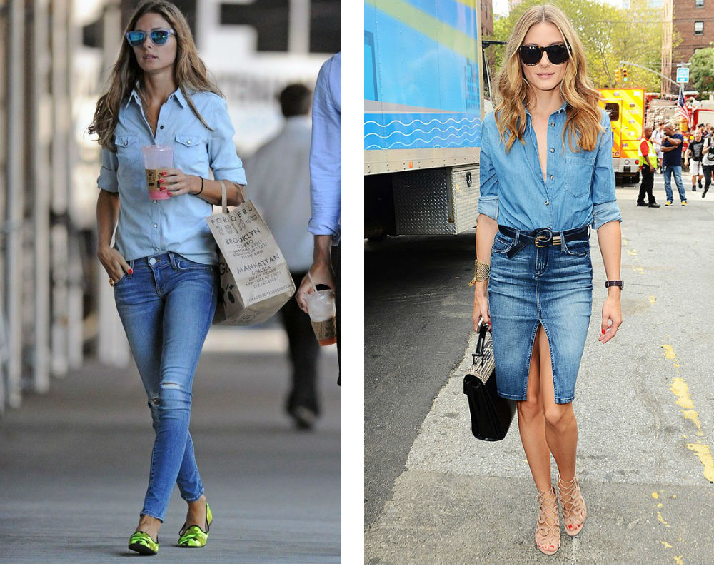 This season, double denim is being encouraged. Once disparagingly described as the Canadian tuxedo, it’s been sartorially acceptable for a while now and trend setters all over the place have perfected the look. Olivia Palermo (seen above and below) is a denim shirt aficionado. This is how to double it up.