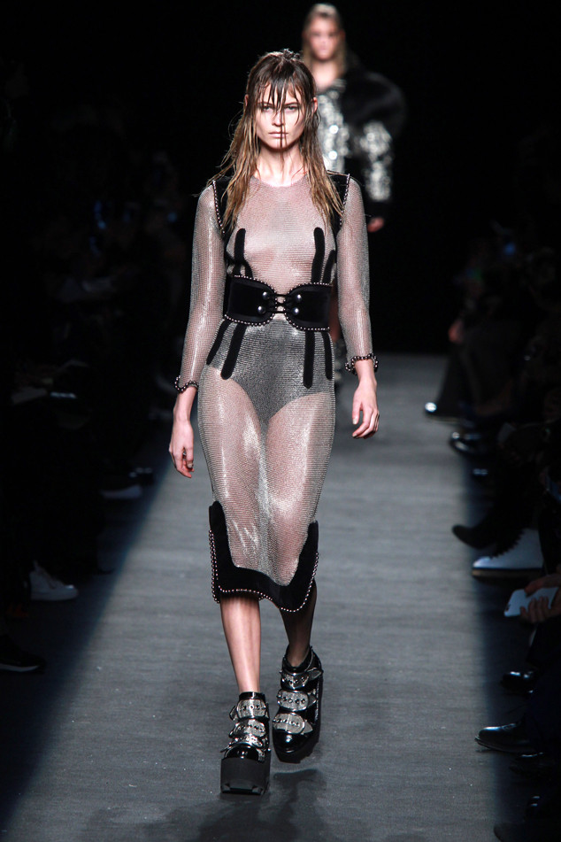 Or it would have been if she had paraded this look two years or so ago. I’m no prude and I’m all for being creative and pushing the boundaries when it comes to your sartorial choices. It’s just that there was a time and a place for transparent gowns and that time has past. We’ve got to ask, if you agree with me and also think that that’s the case, what’s next? If someone like Natalie P, who is generally so elegant and classy, is showing her smalls, what might the usual suspects do to attract attention in the near future? If someone like Natalie Portman is revealing her knicks, might ordinary people on an ordinary Saturday in an ordinary place start doing the same? I’ve got to admit, there are times that sheer apparel looks pretty great, visible pants included. Alexander Wang sent this number for AW15 down the runway: