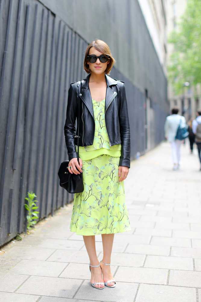 Ella Catliff was snapped out at about at LC:M this week. Her dress is very pretty and pairing it with the leather jacket is a good move and the strappy silver sandals top (or should I say bottom?) it all off.