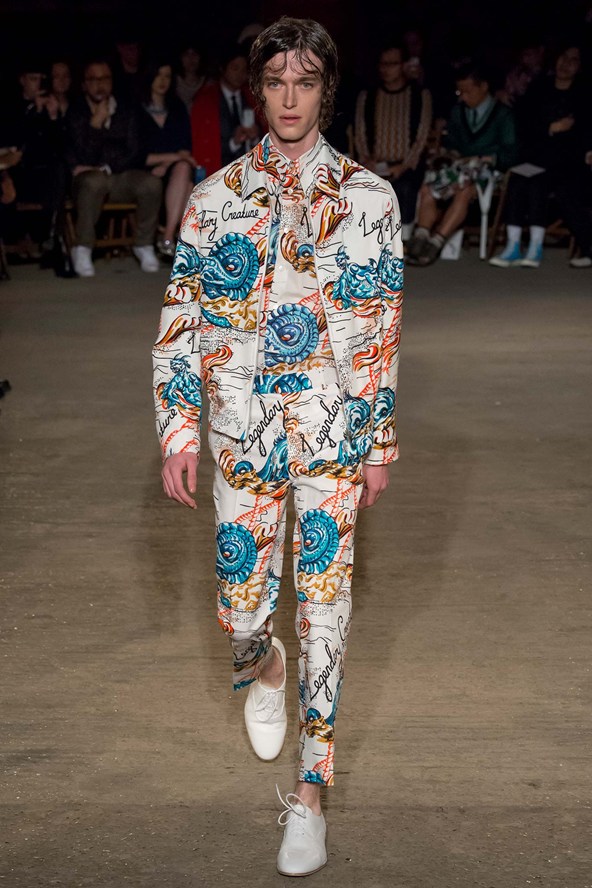 They went a little more extreme in the Alexander McQueen camp, trading the traditional blazer for a light-weight bomber, decorated all over in vivid print. It’s garish at first, but on examination it totally works. Love the slightly feminine brogues too, but the greasy looking hair can probably be given a miss.