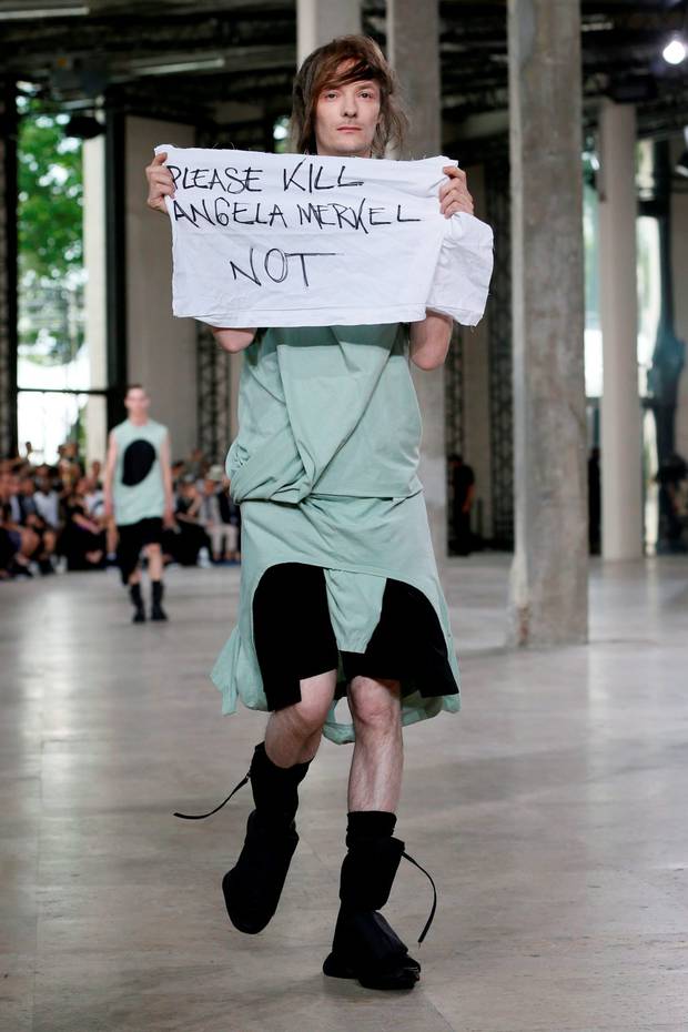 Rick Owens knows a thing or too about controversy, but it’s usually the reaction to his avant-garde designs. This model lapped up all the limelight with his political sign, a gesture which earned him a swift punch in the face when he was done from Mr. Owens, who knew nothing about the stunt. I hardly noticed it though, too busy concentrating on those mind-boggling boots.