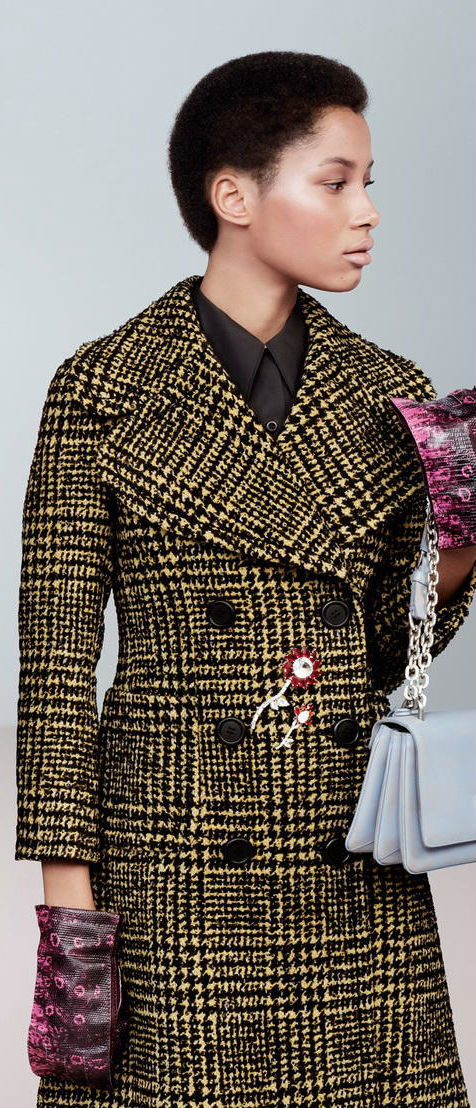 Gloves, button-downs, handbags, all the ladylike elements are there but this season’s Prada woman is not a dweller of Downton Abbey. The unexpected colour and print combinations are eccentric, but the wearer does not reside at Grey Gardens.