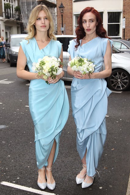 Other fabulous members of the wedding party had to be the bride’s bridesmaids – and daughters – fellow models Lizzie and Georgia May Jagger. But while their gowns matched their mother’s in style, their expressions did not (although Lizzie seemed to enjoy herself as she sucked on a sneaky fag later on in the day).