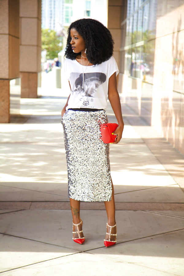 Of course you can wear it with flats, but the midi skirt just works better if you’re in heels. Flats will make your legs look really short; heels with a midi actually lengthens them.